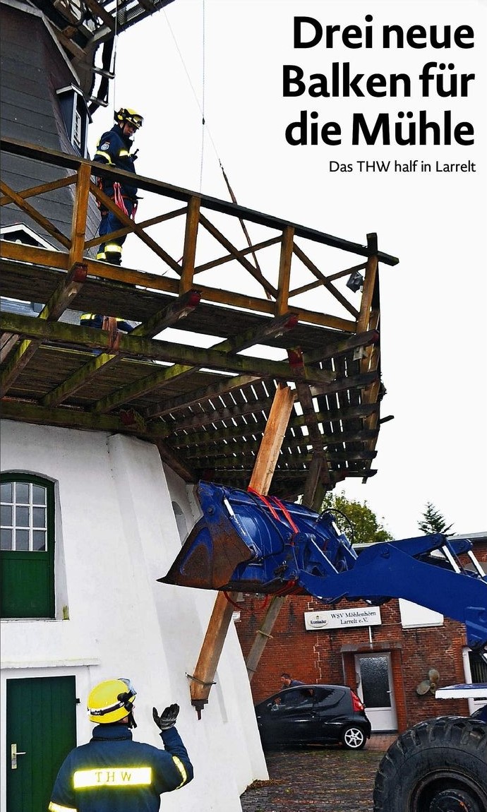 Emden. „Die Galerie ist wieder sicher.” So ganz unsicher war sie zwar nie, wie Bernd-Thomas Martens, Vorsitzende des Dorfvereins Larrelt, sagte. Dass jetzt aber schon einmal zwei von drei maroden Balken gegen neue getauscht sind, beruhigt ihn dennoch. Und es erleichtert ihn, zumal der Dorfverein zunächst nur die 800 Euro teuren Materialkosten für die Reparatur an der Mühle stemmen muss. Er hatte nämlich tatkräftige Unterstützung vom Technischen Hilfswerk (THW). „Die haben das im Rahmen einer Übung gemacht”, sagte Martens. Ob das THW noch bei einem weiteren Problem helfen kann, ist dagegen noch offen. Die Stürme der letzten Wochen haben dem Dach der Mühle stark zugesetzt.